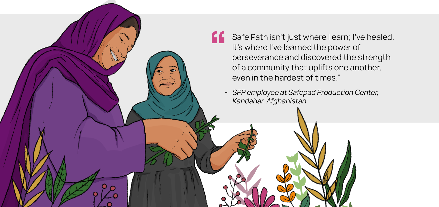 “After losing her husband, Gul Bushra was left alone with six children, the youngest just a month old. Desperate and on the verge of giving her baby away to feed the rest of the children, a job at SPP changed everything. Today, she is filled with love and can’t imagine being without her daughter.”